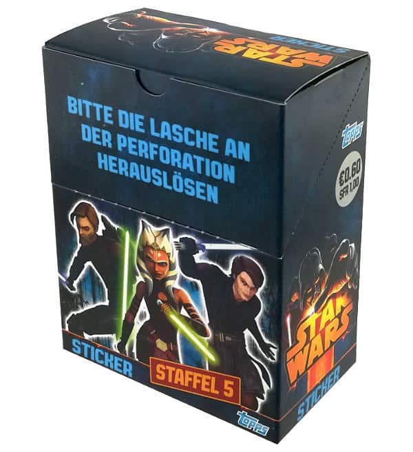 Scatola da 50 bustine per la collezione di figurine "Topps Star Wars Clone Wars S05". Ogni bustina contiene 5 adesivi.