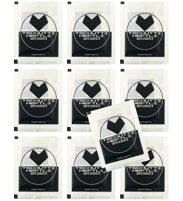 10 bustine della collezione figurine Tschutti Heftli EURO 2020. Ogni bustina contiene 10 adesivi.