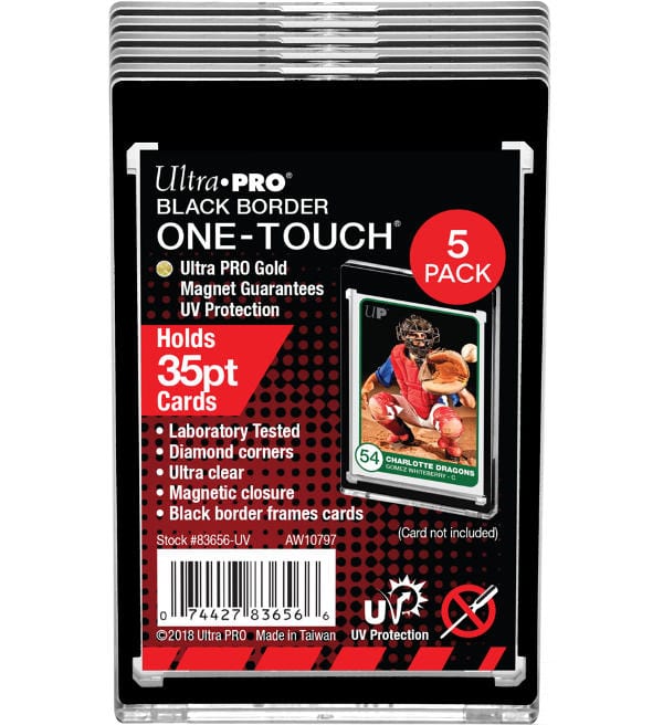 Ultra Pro Black Border One-Touch Magnetic Holder 35PT - 5-Pack. Progettato come la destinazione finale per le tue carte da collezione, i nostri supporti One Touch a due pezzi sono progettati in modo unico con cerniera a scorrimento e chiusura magnetica, così non dovrai mai più usare un cacciavite. Il supporto fornisce una protezione resistente ai raggi UV, senza PVC e senza acidi per garantire che il tuo prezioso successo mantenga la sua condizione mentre è in mostra. I nostri supporti One Touch sono ideali anche per presentare carte da gioco preziose e super rare. Questo modello può contenere carte standard (2-1/2" X 3-1/2") fino a 35pt di spessore.