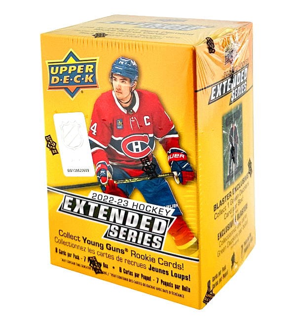 Blaster Box da 7 bustine della collezione "Upper Deck NHL 2022-23 Hockey - Extended Series" Trading Cards. Ogni bustina contiene 8 cards. La box contiene in totale 56 cards.