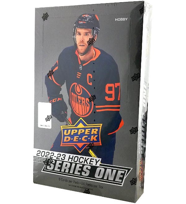 Hobby Box da 24 bustine della collezione "Upper Deck NHL 2022-23 Hockey - Series One" Trading Cards. Ogni bustina contiene 8 cards. La box contiene in totale 192 cards. La scatola è sigillata originale.