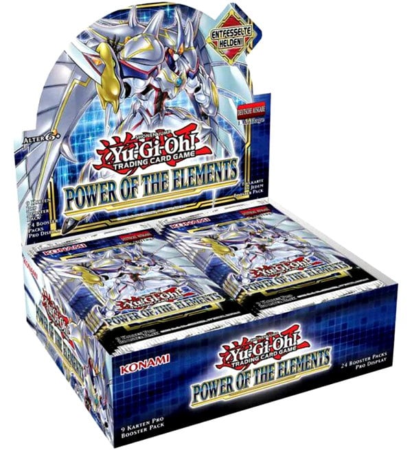 Scatola da 24 bustine della collezione "Yu-Gi-Oh! Power of the Elements" Trading Cards. Ogni bustina contiene 9 cards. La box contiene in totale 216 cards.